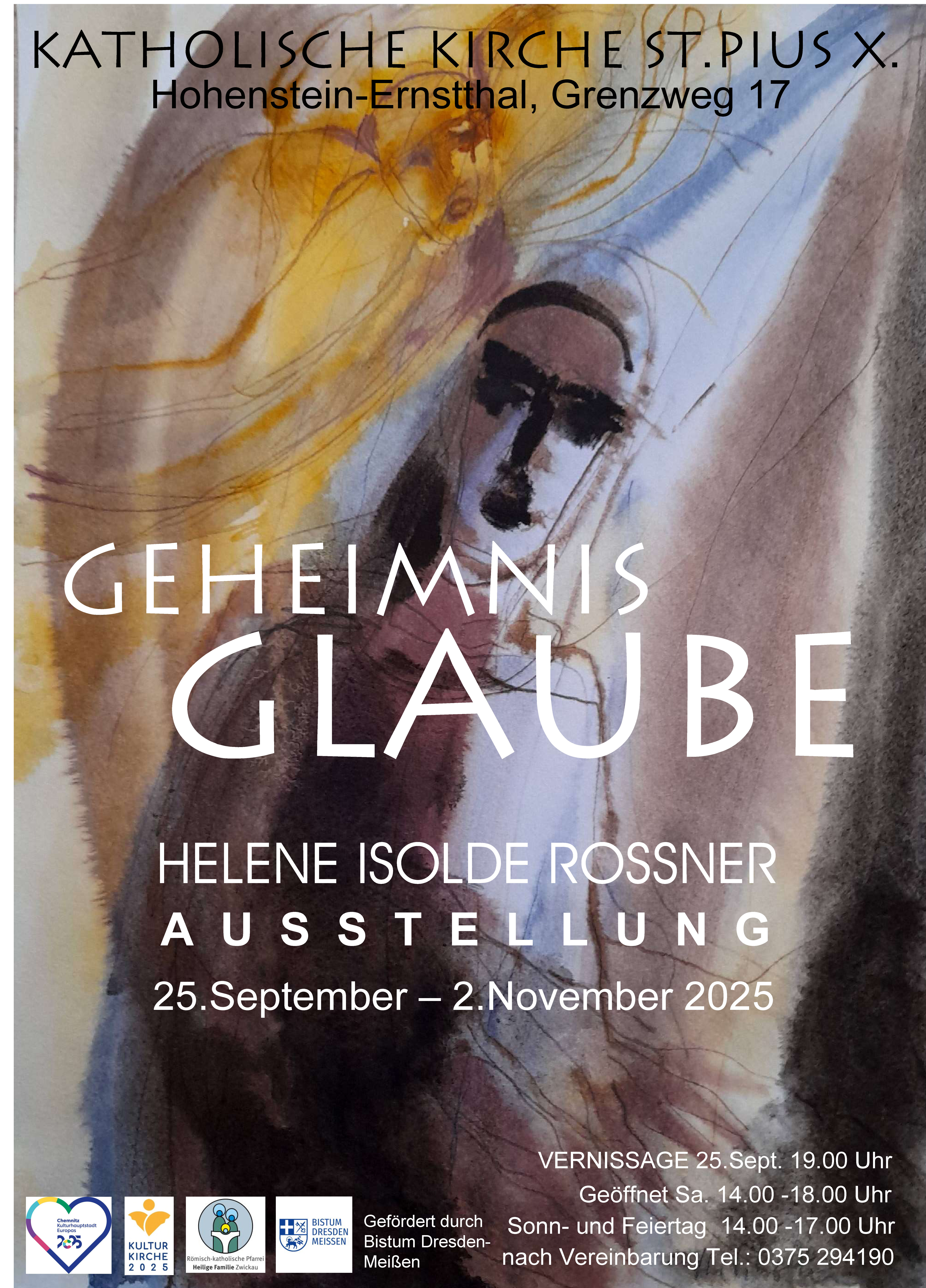 Viele ungesehene Dinge oder unbekannte Orte gibt es im Kulturhauptstadtjahr in Chemnitz und Region zu entdecken. Immer wieder spielt dabei auch die Kunst eine tragende Rolle und eröffnet neue Perspektiven. Unter dem Titel „Geheimnis Glaube“ wird es zwischen dem 25.09. und 02.11. eine Ausstellung mit Werken von Isolde Roßner in unserer kath. Kirche in Hohenstein-Ernstthal geben. Die Künstlerin stammt aus der Region und lebt heute noch hier. In ihren Zeichnungen setzt sie sich mit dem Kulturhauptstadt-Motto, „Siehe das Ungesehene“, auseinander und lenkt den Fokus auf die Bibel. So lädt die Schau dazu ein, nach dem Verborgenen in den biblischen Erzählungen, aber auch in unserem ganz persönlichen Glauben und Leben zu schauen. Ein vielfältiges Rahmenprogramm ergänzt die Ausstellung und setzt eigene musikalische oder geistliche Akzente: